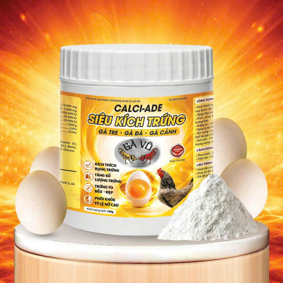 Siêu Kích Trứng Gà Võ là dòng sản phẩm chuyên dùng cho gà tre, gà đá, gà cảnh trong giai đoạn sinh sản. Công thức giàu canxi, vitamin A, D3, E cùng khoáng vi lượng giúp kích thích buồng trứng hoạt động mạnh, rút ngắn thời gian nghỉ giữa các lứa đẻ. Đồng thời giúp trứng có vỏ dày, lòng đỏ đẹp, tăng tỷ lệ nở và cải thiện chất lượng con giống.