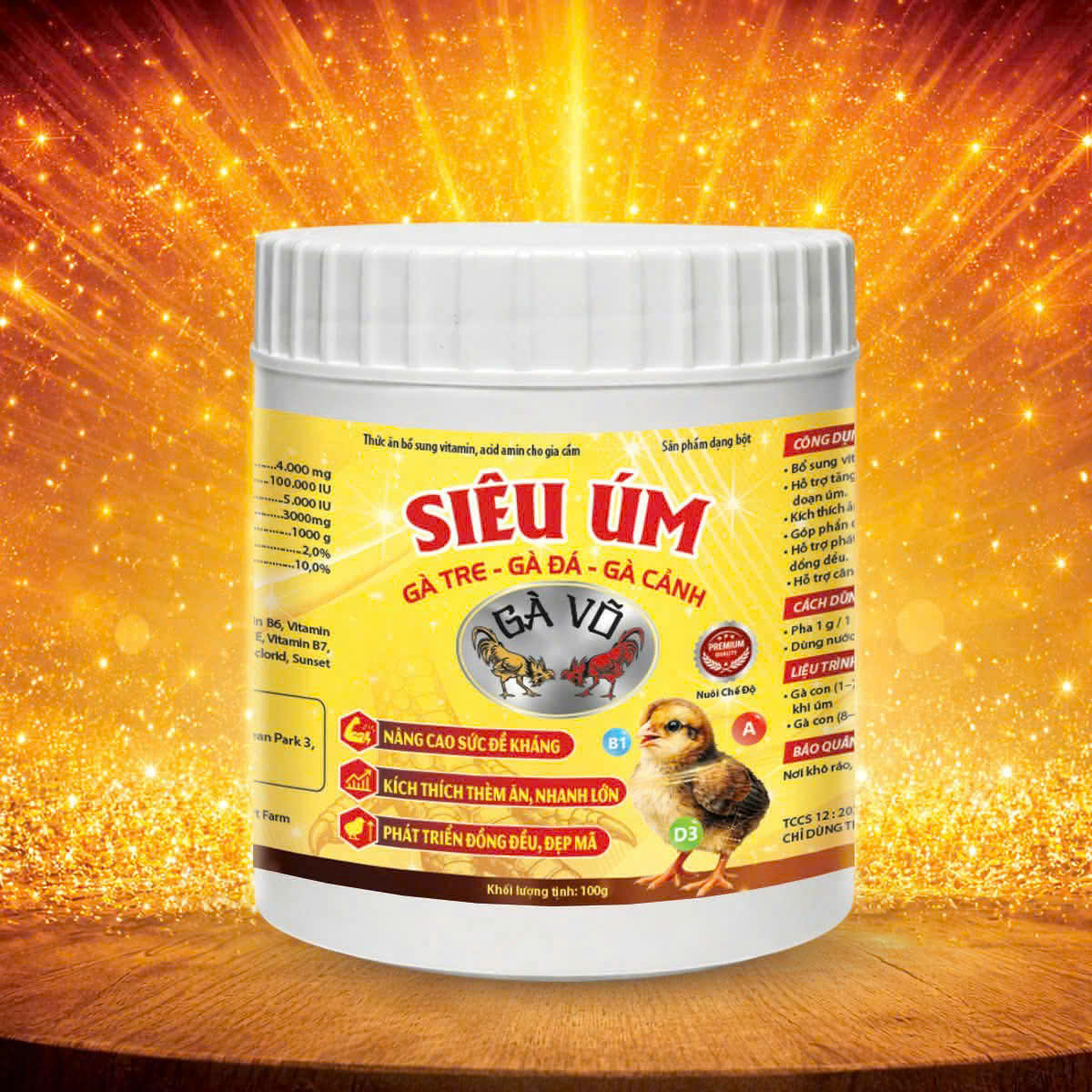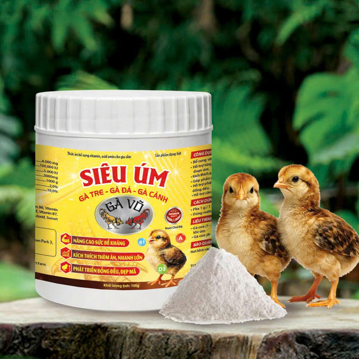 SIÊU ÚM là giải pháp tối ưu cho gà con từ 1–21 ngày tuổi, giúp giảm hao hụt, tăng sức đề kháng và hỗ trợ hệ tiêu hóa hoạt động tốt. Sản phẩm giúp gà con nhanh thích nghi môi trường, ăn khỏe, lớn nhanh, xương chắc, lông mượt và phát triển đồng đều.